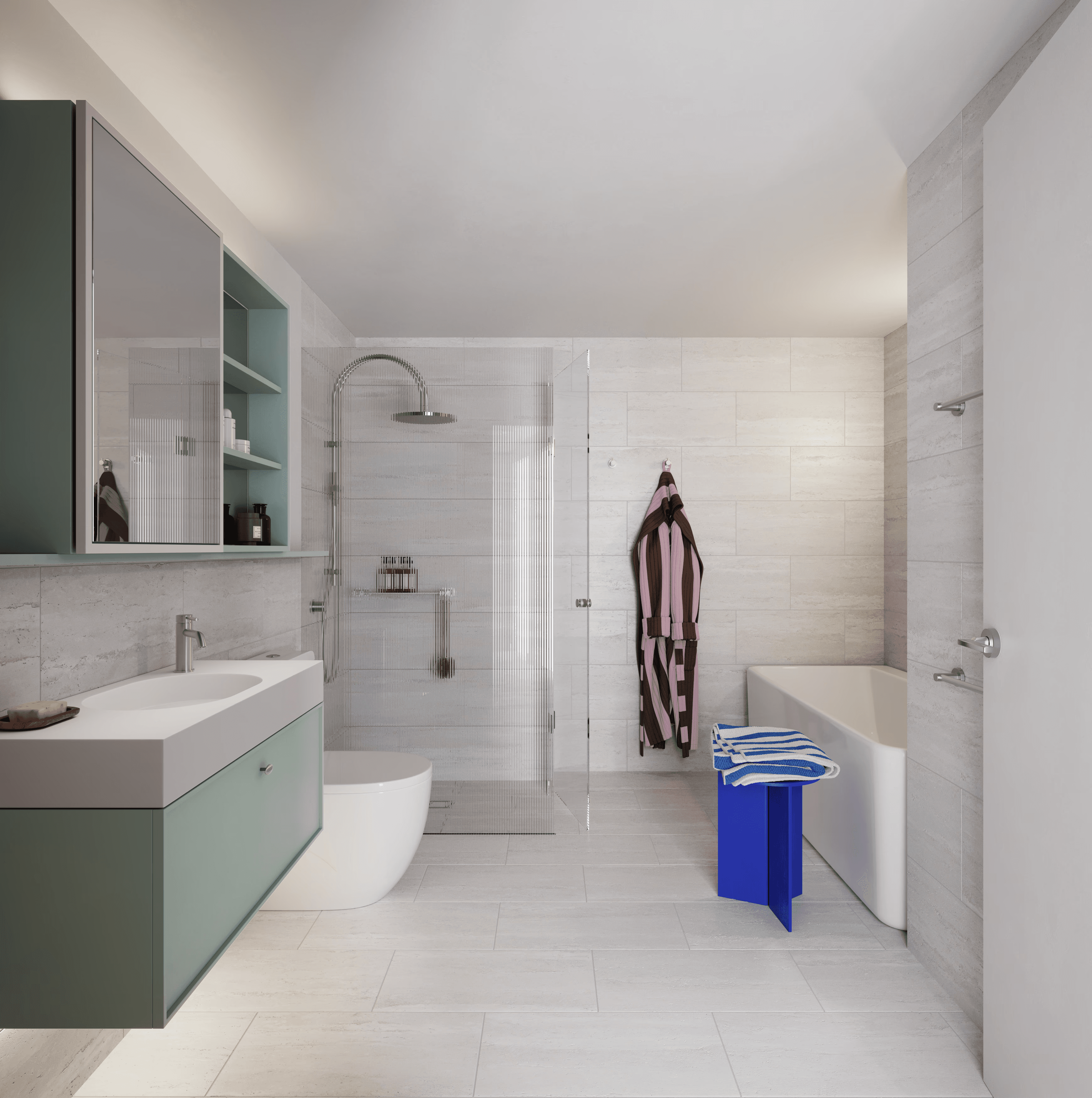 The interior palette nods to Geelong’s coastal and mountainous surrounds — soft shades pulled from the ocean and the distant You Yangs. Materiality is key: matte laminate joinery, artisanal tiling, natural wool and brushed metals bring richness, rhythm and longevity to every detail.